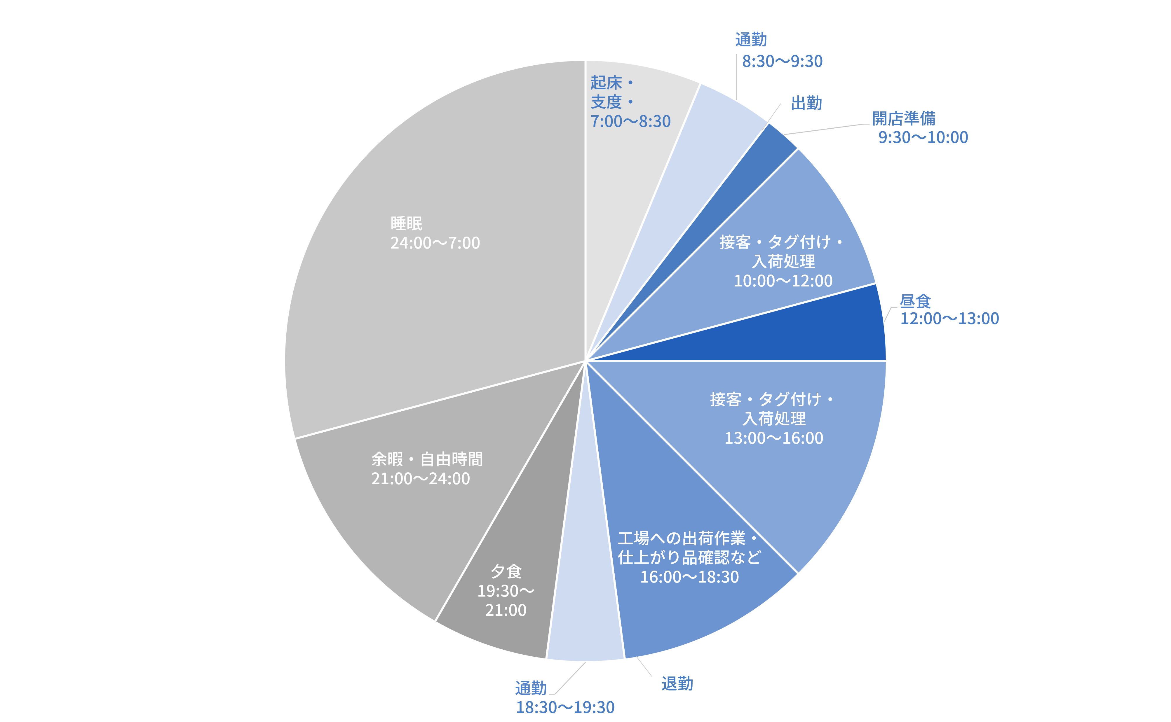 カウンタースタッフには職場によって早番と遅番があります。状況に応じてシフトが替わりますが、早番・遅番で行う仕事は大きく変わりません。常時、お客さまがいらっしゃった際の接客業務のほか、お預かりしたお洋服へのタグ付けなどにはじまる出荷業務・仕上がったクリーニング品をチェックする入荷業務などを行います。